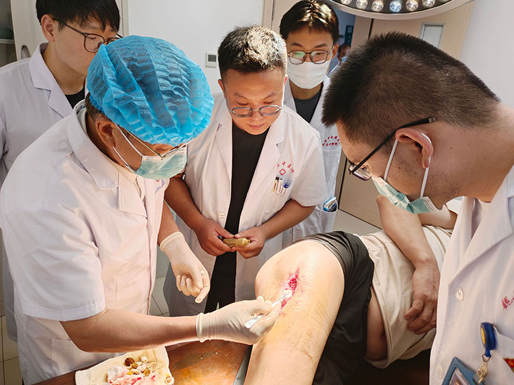 8月18日,應河北魏縣中醫(yī)醫(yī)院之邀,再生醫(yī)學知名專家、《中國燒傷創(chuàng)瘍雜志》常務編委趙瑞慶主任,在該院會診了三例創(chuàng)面患者(下肢外傷皮膚深部感染、腦出血合併巨大壓瘡、肢體多部位瀝青燒傷),并親自演示了操作程序,在討論環(huán)節(jié)提供了一對一的治療方法。